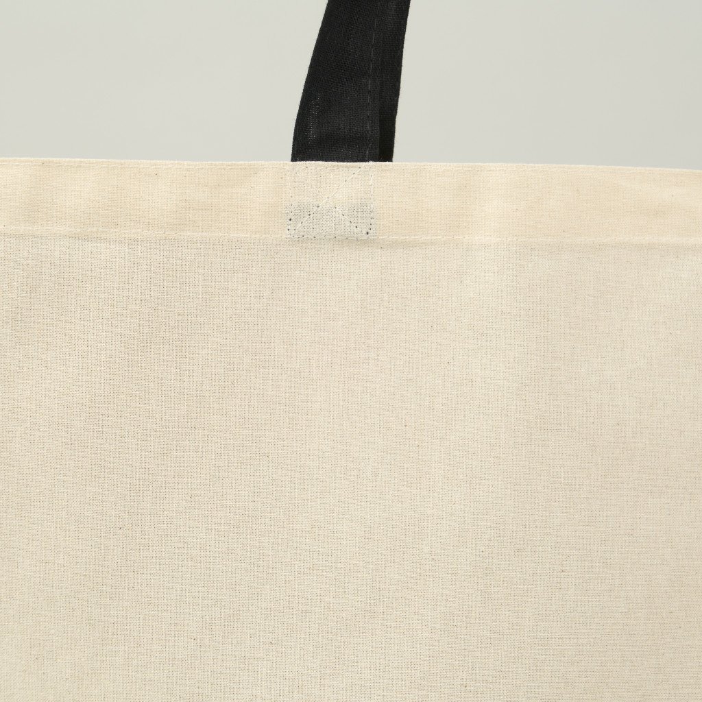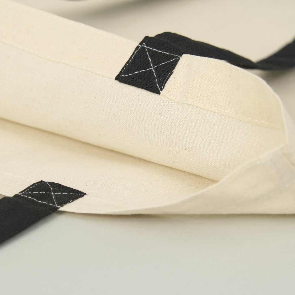 Bolsa de algodón de 6 onzas (170gr/m2), tamaño para productos medianos. Asa de cinta de algodón negro de 65 cm de largo y 2.5 cm de ancho.